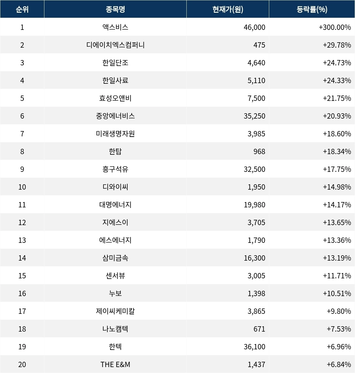 6위 중앙에너비스(000440)는 현재가 3만 5250원으로 20.9% 상승 중이다. 7위 미래생명자원(218150)은 현재가 3985원으로 18.6% 상승 중이다. 8위 한탑(002680)은 현재가 968원으로 18.3% 상승 중이다. 9위 흥구석유(024060)는 현재가 3만 2500원으로 17.8% 상승 중이다. 10위 디와이씨(310870)는 현재가 1950원으로 15.0% 상승 중이다.