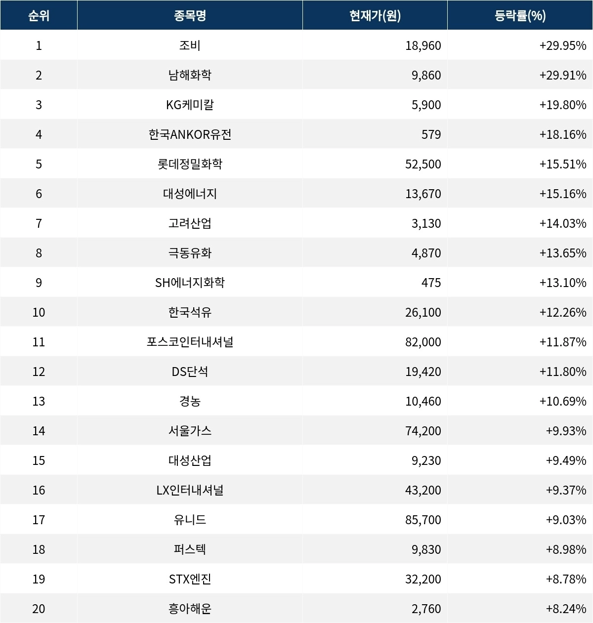 6위 대성에너지(117580)는 현재가 1만 3670원으로 15.2% 상승 중이다. 7위 고려산업(002140)은 현재가 3130원으로 14.0% 상승 중이다. 8위 극동유화(014530)는 현재가 4870원으로 13.7% 상승 중이다. 9위 SH에너지화학(002360)은 현재가 475원으로 13.1% 상승 중이다. 10위 한국석유(004090)는 현재가 2만 6100원으로 12.3% 상승 중이다.