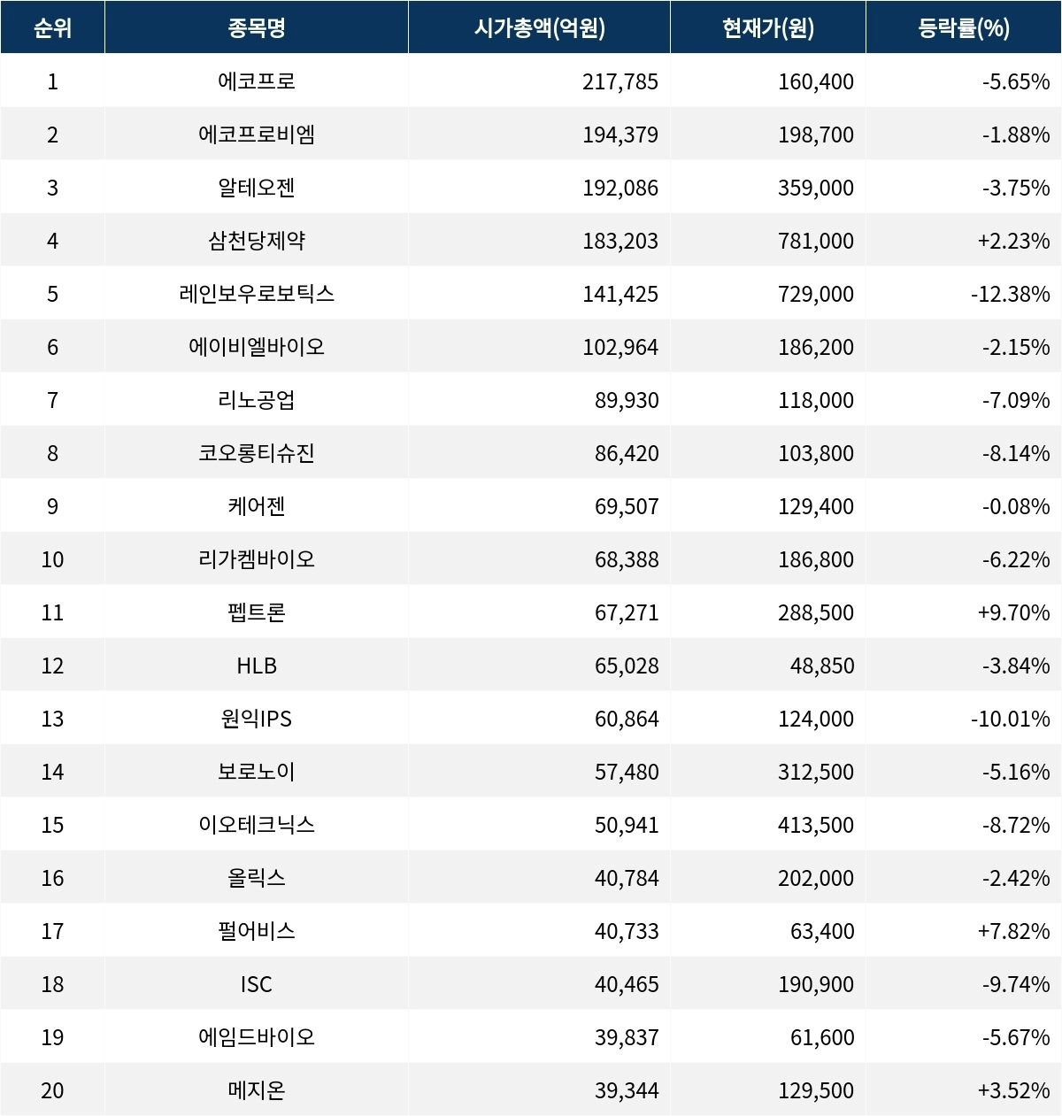 시가총액 3위 알테오젠(196170)은 3.75% 하락하고 있으며 삼천당제약(000250)은 2.23% 상승 중이다. 레인보우로보틱스(277810)는 12.38% 급락세를 보이고 있고 에이비엘바이오(298380)는 2.15% 하락세를 기록 중이다. 리노공업(058470)은 7.09% 하락, 코오롱티슈진(950160)은 8.14% 하락, 케어젠(214370)은 0.08% 하락, 리가켐바이오(141080)는 6.22% 하락하고 있다.