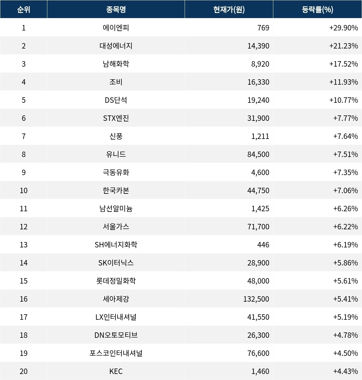 이 밖에도 남선알미늄(008350) 6.3%, 서울가스(017390) 6.2%, SH에너지화학(002360) 6.2%, SK이터닉스(475150) 5.9%, 롯데정밀화학(004000) 5.6%, 세아제강(306200) 5.4%, LX인터내셔널(001120) 5.2%, DN오토모티브(007340) 4.8%, 포스코인터내셔널(047050) 4.5%, KEC(092220) 4.4% 등을 기록하며 이날 증시를 상승으로 마감했다.