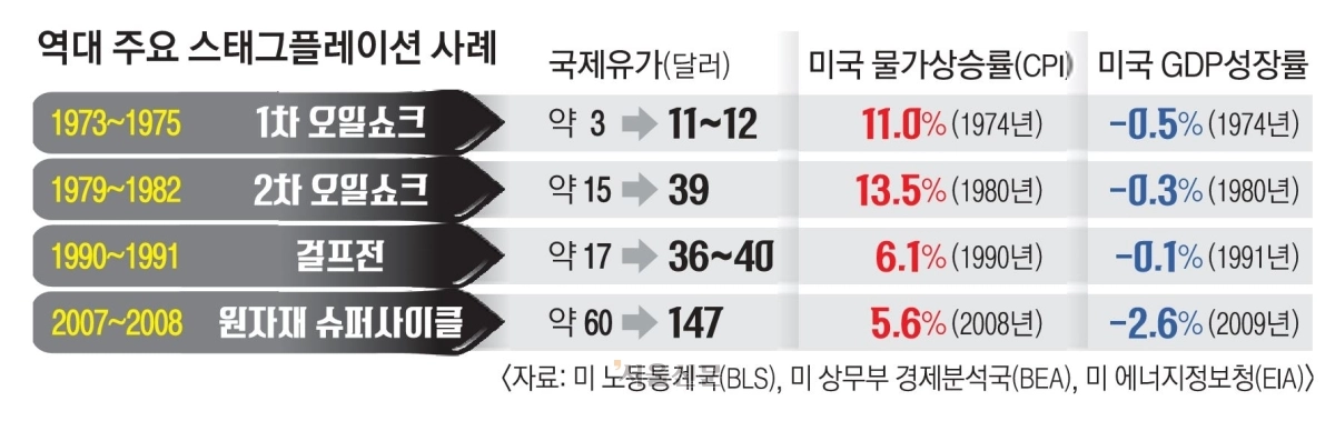 대표적인 사례가 1970년대 오일쇼크다. 중동전쟁 이후 산유국 감산으로 국제 유가는 약 3달러에서 11~12달러로 약 4배 급등했다. 이에 따라 1974년 미 소비자물가 상승률은 11.0%까지 치솟았고 같은 해 미 경제성장률은 -0.5%를 기록했다. 1979년 이란 혁명 이후 발생한 2차 오일쇼크 때도 국제 유가는 약 15달러에서 39달러까지 상승했고 미 물가 상승률은 1980년 13.5%까지 올라갔다. 같은 해 경제성장률은 -0.3%로 떨어지며 고물가와 경기 둔화가 동시에 나타났다.