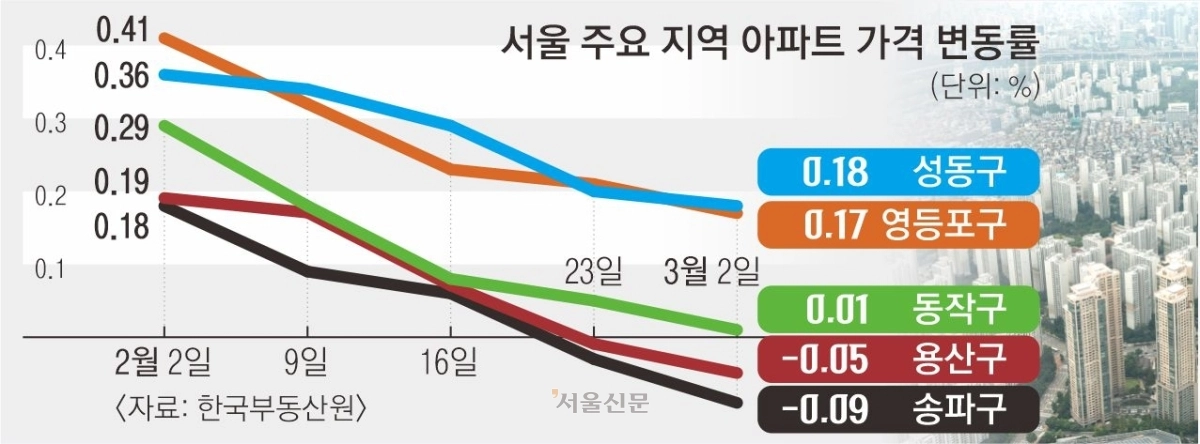 특히 강남구의 3월 첫 주 낙폭이 0.07%로 2월 마지막 주의 0.06%에 비해 소폭 커졌고, 같은 기간 송파구는 0.03%에서 0.09%로 내림세가 강화됐다. 2월 마지막 주에 0.01% 내렸던 용산구도 3월 첫주에 0.05%로 내림세가 커졌다. 서초구도 3월 첫 주에 0.01% 하락해 전주에 이어 내림세가 계속됐다.