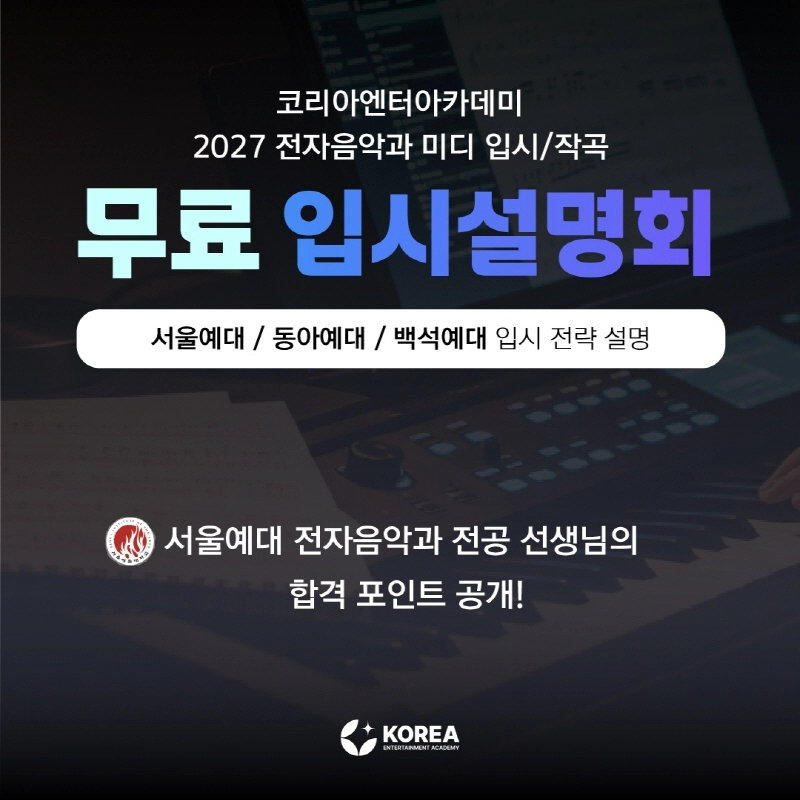 코리아엔터아카데미가 지난 2월 12일(목) 오후 7시 30분, 2027학년도 전자음악 및 미디 입시를 준비하는 수험생과 학부모를 대상으로 진행한 ‘무료 입시 설명회’를 성공적으로 마쳤다고 밝혔다.
