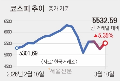 코스피는 이날 전 거래일 대비 280.72포인트(5.35%) 오른 5532.59에 거래를 마쳤다. 장중 한때 5595.88까지 올라 등락률 6.55%을 기록하기도 했다. 미국·이스라엘의 이란 침공 이후 하루에 5~10%씩 지수가 등락하는 극심한 변동성 장세가 이어지고 있다.