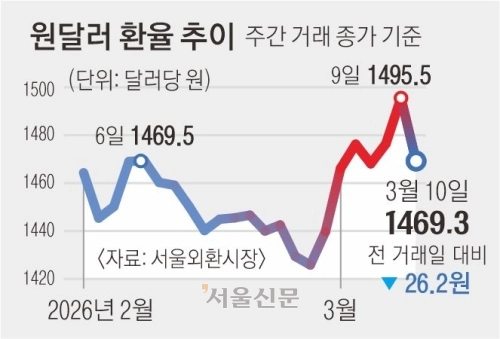 원달러 환율 하루 만에 1460원대중동 전쟁 조기 종식 기대감에 전날 폭락했던 코스피가 10일 5%대 뛰어올라 5500선을 회복했다. 장 초반엔 급등세 속 올해 여덟 번째 코스피 사이드카(프로그램 매수호가 일시효력 정지)도 발동됐다. 전날 1500원 돌파를 눈앞에 뒀던 원달러 환율은 이날 1460원대로 떨어지며 안정을 찾았다.