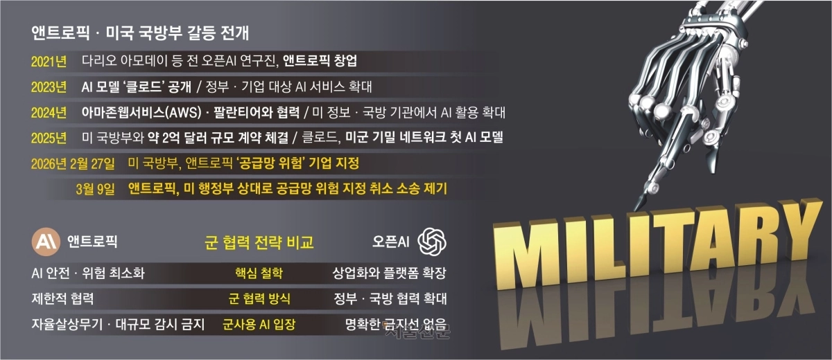 미국 인공지능(AI) 기업 앤트로픽이 미 정부를 상대로 유례없는 법정 공방에 나섰다. 앤트로픽이 AI 모델 ‘클로드’를 군사적으로 활용하려는 미 국방부에 제동을 걸자, 국방부가 앤트로픽을 ‘공급망 위험’ 기업으로 지정한데 대한 반발이다. 민간 AI 기업이 세운 기술 윤리 원칙이 국가 안보 정책과 충돌해 사법부의 판단을 받는 첫 사례여서 실리콘밸리는 AI 기술의 활용 주도권을 둔 ‘민관 대결’로 보고 있다.