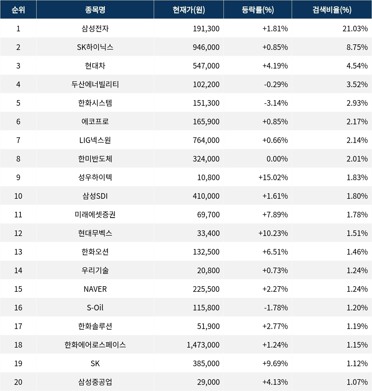 이 밖에도 미래에셋증권(006800) ▲7.89%, 현대무벡스(319400) ▲10.23%, 한화오션(042660) ▲6.51%, 우리기술(032820) ▲0.73%, NAVER(035420) ▲2.27%, S-Oil(010950) ▼1.78%, 한화솔루션(009830) ▲2.77%, 한화에어로스페이스(012450) ▲1.24%, SK(034730) ▲9.69%, 삼성중공업(010140) ▲4.13% 등이 많이 검색되고 있다.