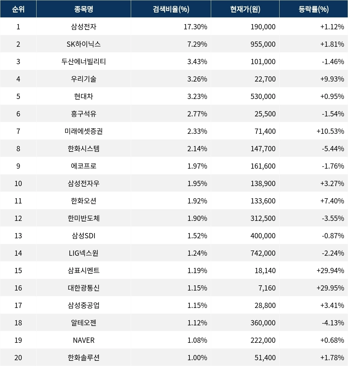 이어 검색 비율 2위의 SK하이닉스(000660)는 상승률 1.81%로 상승 마감했다. 검색 비율 3위의 두산에너빌리티(034020)는 1.46% 하락 마감했다. 검색 비율 4위 우리기술(032820)은 9.93% 상승으로 마감했다. 검색 비율 5위 현대차(005380)는 0.95% 상승하며 강보합으로 마감했다.