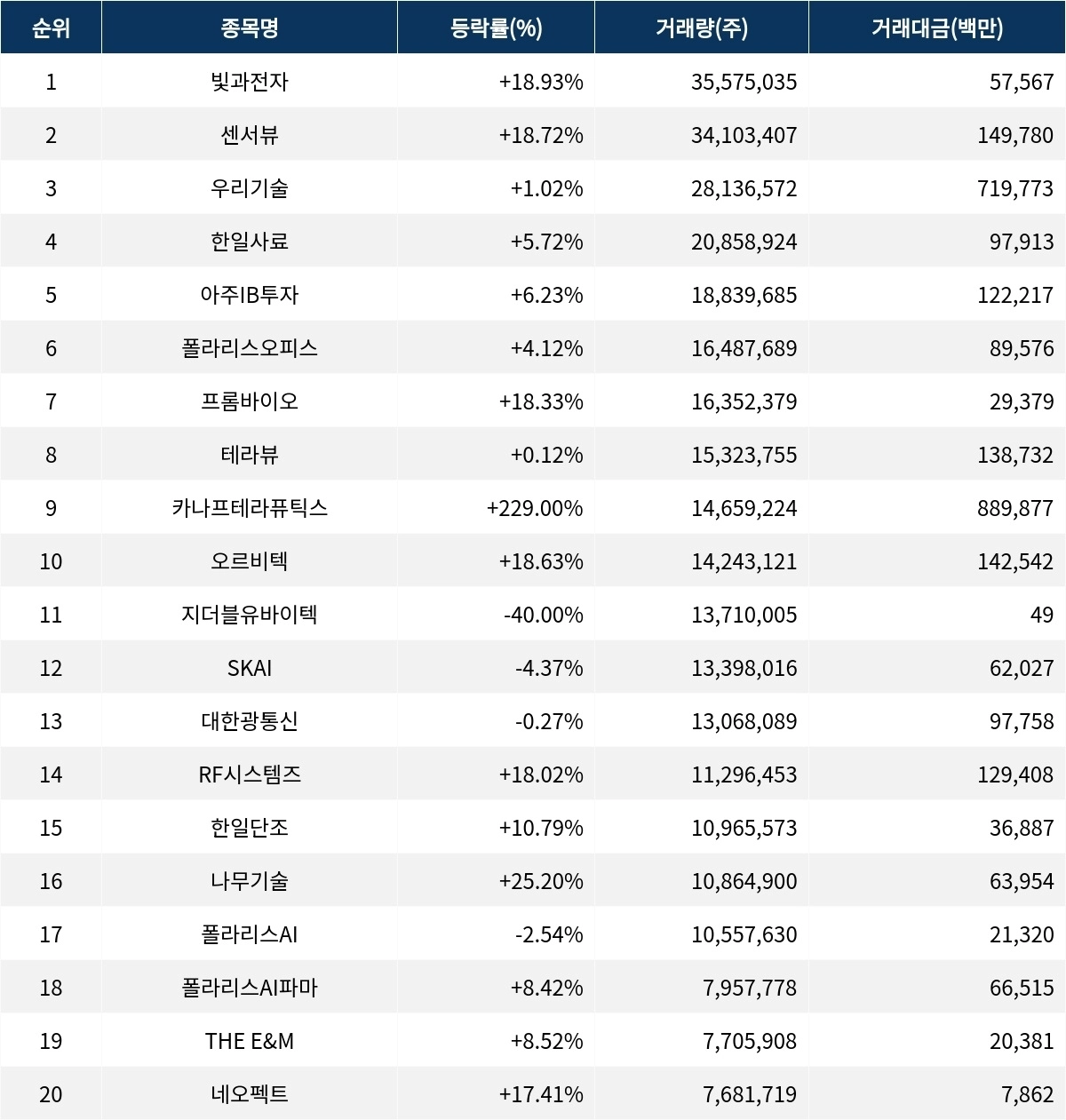 한편 거래량 상위 20위권 종목들은 지더블유바이텍(036180) ▼40.00%, SKAI(357880) ▼4.37%, 대한광통신(010170) ▼0.27%, RF시스템즈(474610) ▲18.02%, 한일단조(024740) ▲10.79%, 나무기술(242040) ▲25.20%, 폴라리스AI(039980) ▼2.54%, 폴라리스AI파마(041910) ▲8.42%, THE E&M(089230) ▲8.52%, 네오펙트(290660) ▲17.41% 등의 성적을 기록했다.