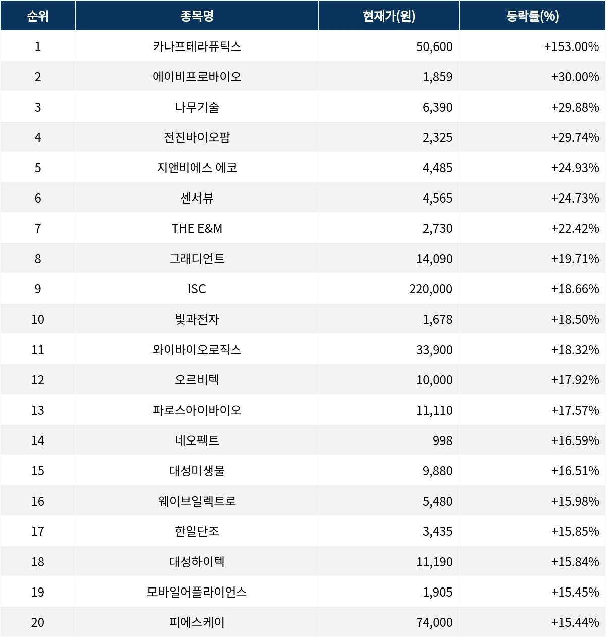 6위 센서뷰(321370)는 4565원으로 24.73% 상승 마감했다. 7위 THE E&M(089230)은 종가 2730원으로 22.42% 상승 마감했다. 8위 그래디언트(035080)는 종가 1만 4090원으로 19.71% 상승 마감했다. 9위 ISC(095340)는 22만원으로 18.66% 상승 마감했다. 10위 빛과전자(069540)는 1678원으로 18.50% 상승 마감했다.