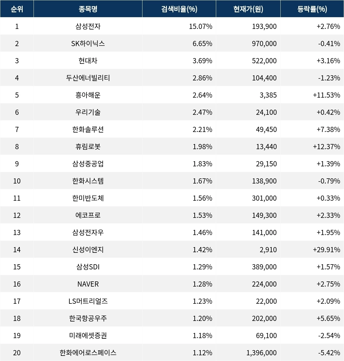 이어 검색 비율 2위인 SK하이닉스(000660)는 등락률 -0.41%로 보합 마감했다. 검색 비율 3위인 현대차(005380)는 3.16% 상승 마감했다. 검색 비율 4위 두산에너빌리티(034020)는 하락률 -1.23%로 하락 마감했다. 검색 비율 5위 흥아해운(003280)은 11.53% 급등하며 거래를 마쳤다.