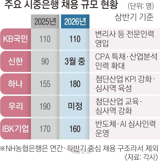채용의 초점은 ‘규모’에서 ‘전문성’으로 이동하고 있다. 국민은행과 신한은행은 변리사, 엔지니어 등 외부 전문가 영입에 나섰고, 신한은행은 공인회계사(CPA) 30명 규모 특별채용과 산업분석 인력 확보를 병행하고 있다. 반도체·바이오·인공지능(AI) 등 첨단 산업을 평가하려면 기존 제조업 중심 심사 경험만으로는 한계가 있다는 판단에서다. 시중은행 관계자는 “생산적 금융의 핵심은 대출 규모가 아니라 기업을 선별하는 능력”이라며 “산업 이해도가 높은 인력 수요가 빠르게 늘고 있다”고 말했다.
