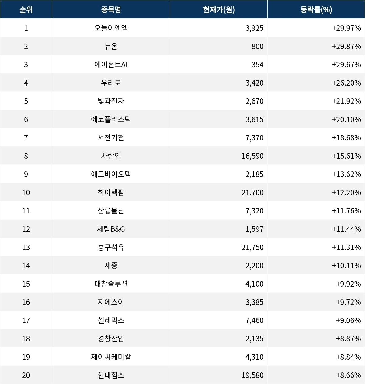 [서울데이터랩]‘오늘이엔엠’ 29.97% 상한가…실시간 상승률 1위