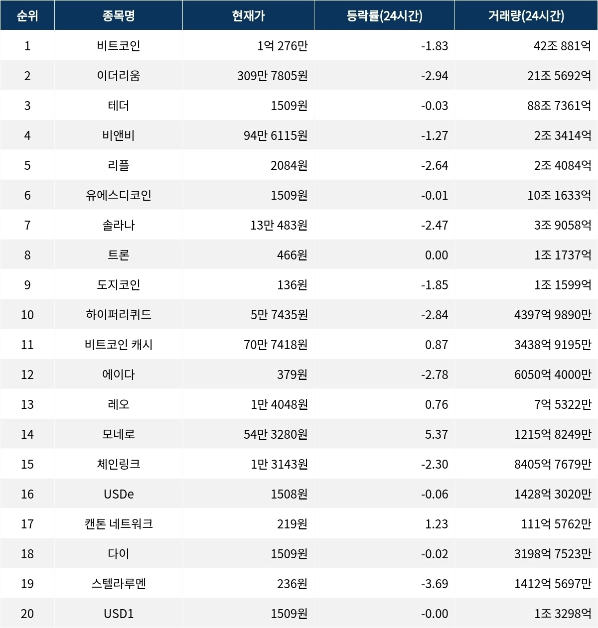 한편 솔라나는 13만 483원에 거래되며 24시간 동안 -2.47% 하락했다. 시가총액은 74조 6543억 원이다. 같은 시각 트론은 466원에 거래 중이며 24시간 등락률은 0.00%로 변동이 없다. 시가총액은 44조 1832억 원이다.