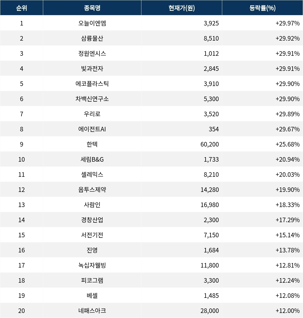 6위 차백신연구소(261780)는 5,300원으로 29.90% 상승 마감했다. 7위 우리로(046970)는 종가 3,520원으로 29.89% 상승 마감했다. 8위 에이전트AI(060900)는 종가 354원으로 29.67% 상승 마감했다. 9위 한텍(098070)은 60,200원으로 25.68% 상승 마감했다. 10위 세림B&G(340440)는 1,733원으로 20.94% 상승 마감했다.