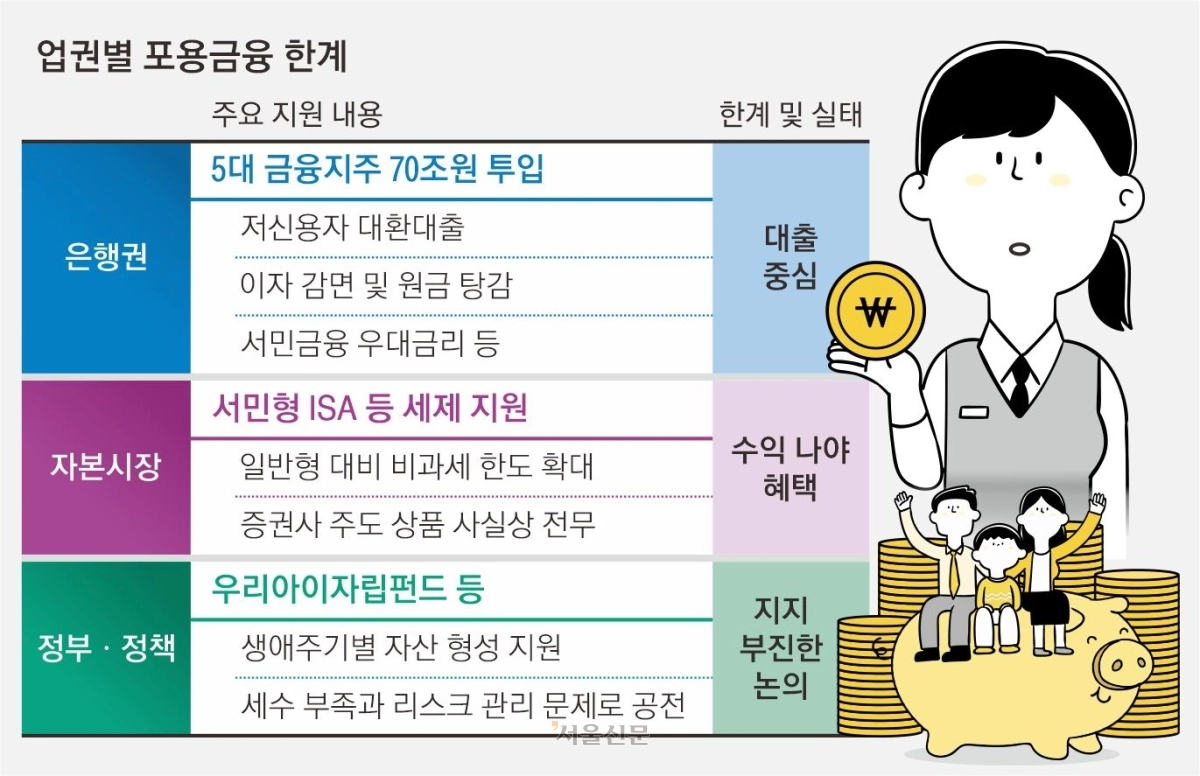 금융지주들의 포용금융 계획 역시 대출 중심 구조다. KB금융(17조원), 신한금융(15조원), 하나금융(16조원), 우리금융(7조원), NH농협금융(15조원) 등이 향후 수년간 대규모 자금을 투입할 계획이지만, 대부분 은행·저축은행·카드 등 대출 중심 계열사를 통해 집행된다. 증권사가 제출한 계획은 사회공헌 프로그램 수준에 그친 것으로 알려졌다. ‘포용금융’이 사실상 ‘포용대출’에 머물러 있다는 평가가 나오는 이유다.