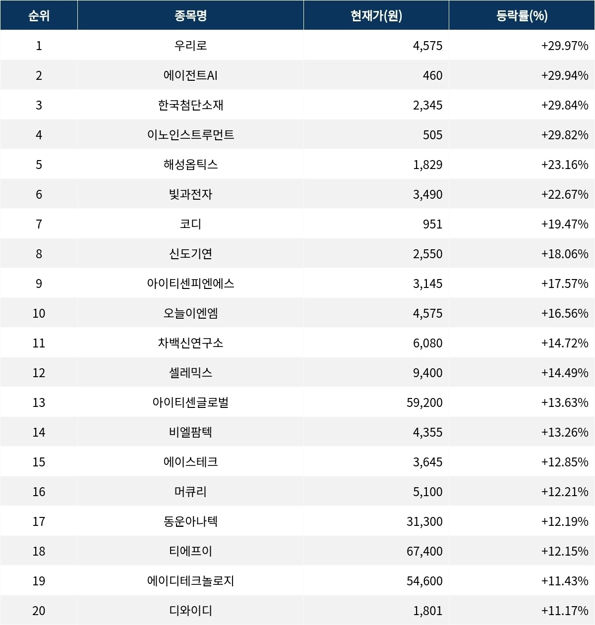 6위 빛과전자(069540)는 현재가 3490원으로 22.67% 상승 중이다. 7위 코디(080530)는 현재가 951원으로 19.47% 상승 중이다. 8위 신도기연(290520)은 현재가 2550원으로 18.06% 상승 중이다. 9위 아이티센피엔에스(232830)는 현재가 3145원으로 17.57% 상승 중이다. 10위 오늘이엔엠(192410)은 현재가 4575원으로 16.56% 상승 중이다.