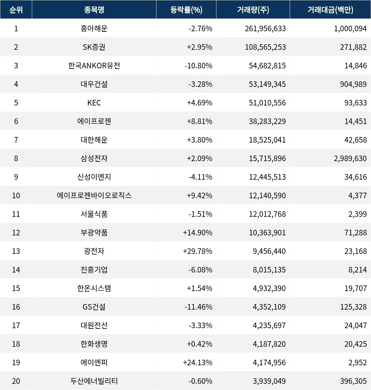 한편 거래량 상위 20위권 종목들은 대원전선(006340) ▼3.33%, 한화생명(088350) ▲0.42%, 에이엔피(015260) ▲24.13%, 두산에너빌리티(034020) ▼0.60% 등의 성적을 기록했다.