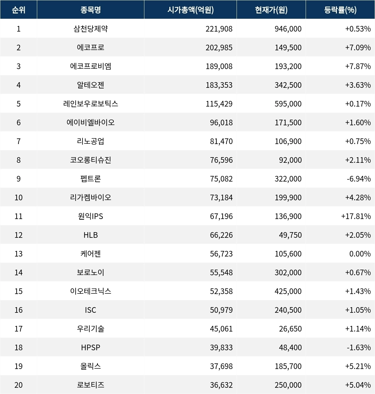시가총액 상위 종목들은 전반적으로 다양한 주가 변동을 보이며, 특히 원익IPS와 펩트론의 등락폭이 두드러진다. 이러한 주가 변동은 해당 종목들의 거래량과 외국인 비율 등에 의해 영향을 받는 것으로 보인다.