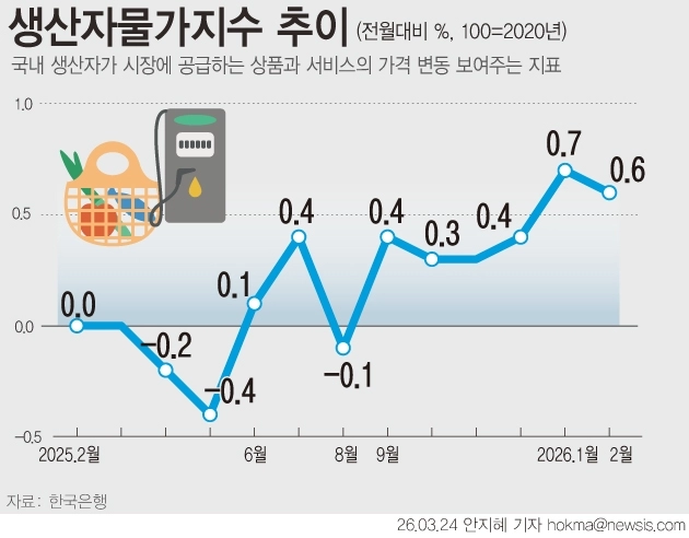 한국은행이 24일 발표한 지난달 생산자물가지수(잠정)는 1월(122.56)보다 0.6% 높은 123.25(2020년=100 기준)로 집계됐다. 지난해 9월 이후 6개월 연속 오름세다. 전년 동월(120.33)과 비교하면 2.4% 올라 2024년 7월(2.6%) 이후 가장 높다. 생산자물가는 생산자가 시장에 공급하는 상품과 서비스의 가격으로 통상 1~3개월 정도 시차를 두고 소비자물가에 반영된다.