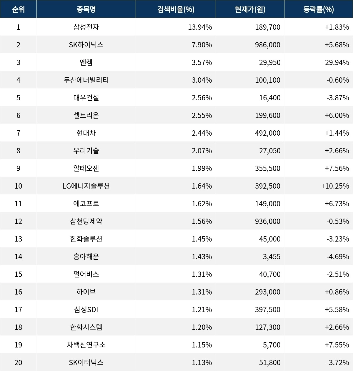 이어 검색비율 2위의 SK하이닉스(000660)는 상승률 5.68%로 상승 마감했다. 검색비율 3위의 엔켐(348370)은 -29.94%의 하락률로 하한가를 기록했다. 검색비율 4위 두산에너빌리티(034020)는 -0.60%로 보합 마감했다. 검색비율 5위 대우건설(047040)은 -3.87% 하락 마감했다.