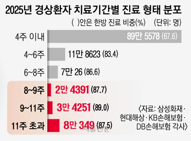 하지만 8주를 넘기면 양상이 달라진다. 한방 치료 비중이 ▲8~9주 87.7% ▲9~11주 89.0% ▲11주 초과 87.5%로 나타났다. 8주를 넘겨 치료가 길어질수록 특정 진료 형태로 쏠림이 심화되는 구조다. 손보사 관계자는 “현재는 8주 이후 치료를 검증할 제도적 장치가 아예 없다”며 “가벼운 부상도 장기 치료로 이어지면서 보험금 지급이 늘고 있다”고 말했다.