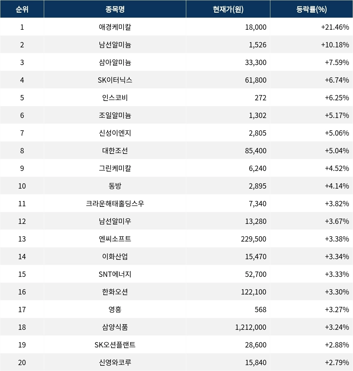 6위 조일알미늄(018470)은 현재가 1302원으로 5.17% 상승 중이다. 7위 신성이엔지(011930)는 현재가 2805원으로 5.06% 상승 중이다. 8위 대한조선(439260)은 현재가 8만 5400원으로 5.04% 상승 중이다. 9위 그린케미칼(083420)은 현재가 6240원으로 4.52% 상승 중이다. 10위 동방(004140)은 현재가 2895원으로 4.14% 상승 중이다.