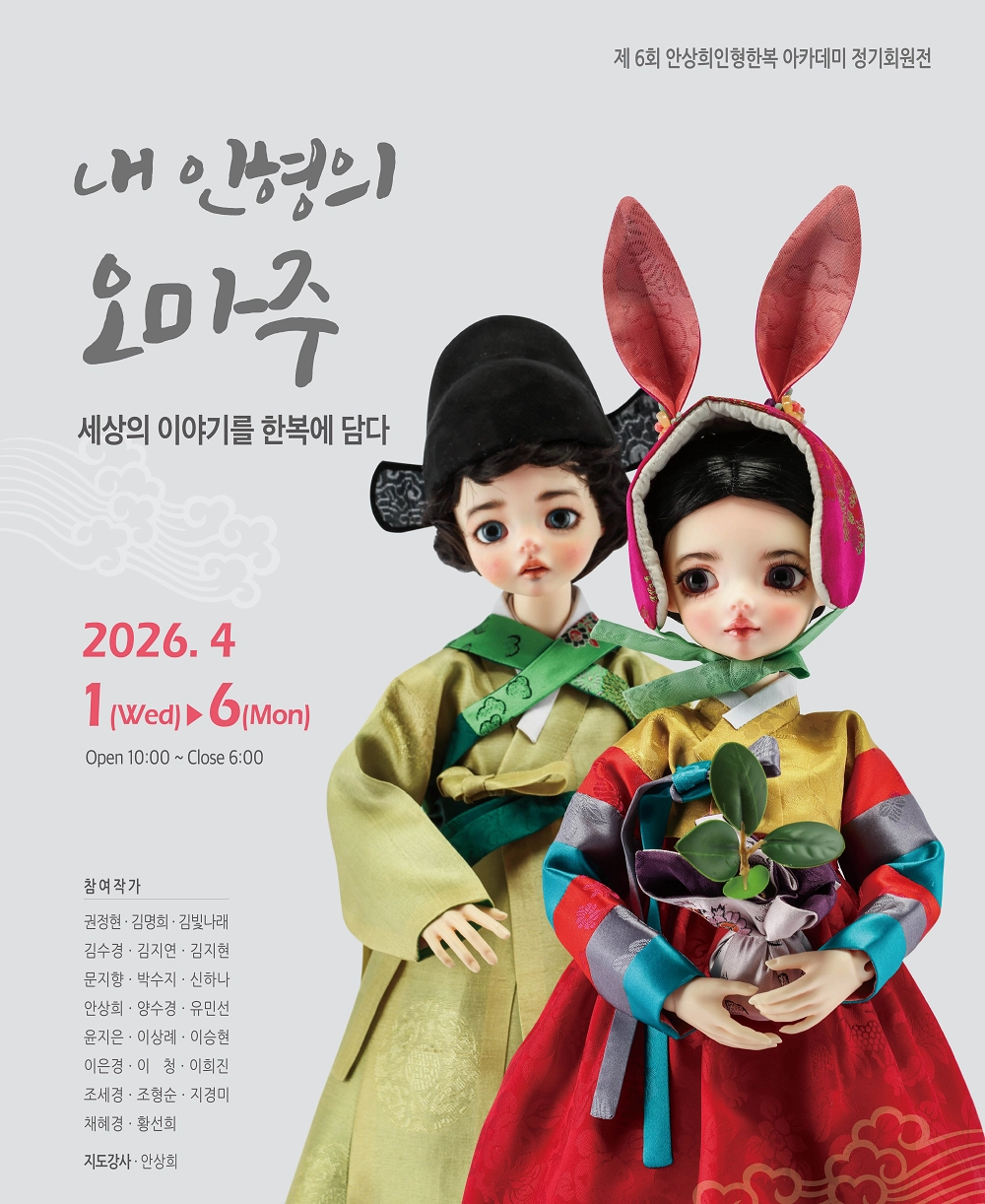 한복의 아름다움을 인형으로 구현해 온 ‘안상희 인형한복 아카데미’가 오는 4월 1일부터 6일까지 인사동 아리수 갤러리에서 제6회 정기회원전 [내 인형의 오마주: 세상의 이야기를 한복에 담다]를 개최한다.
