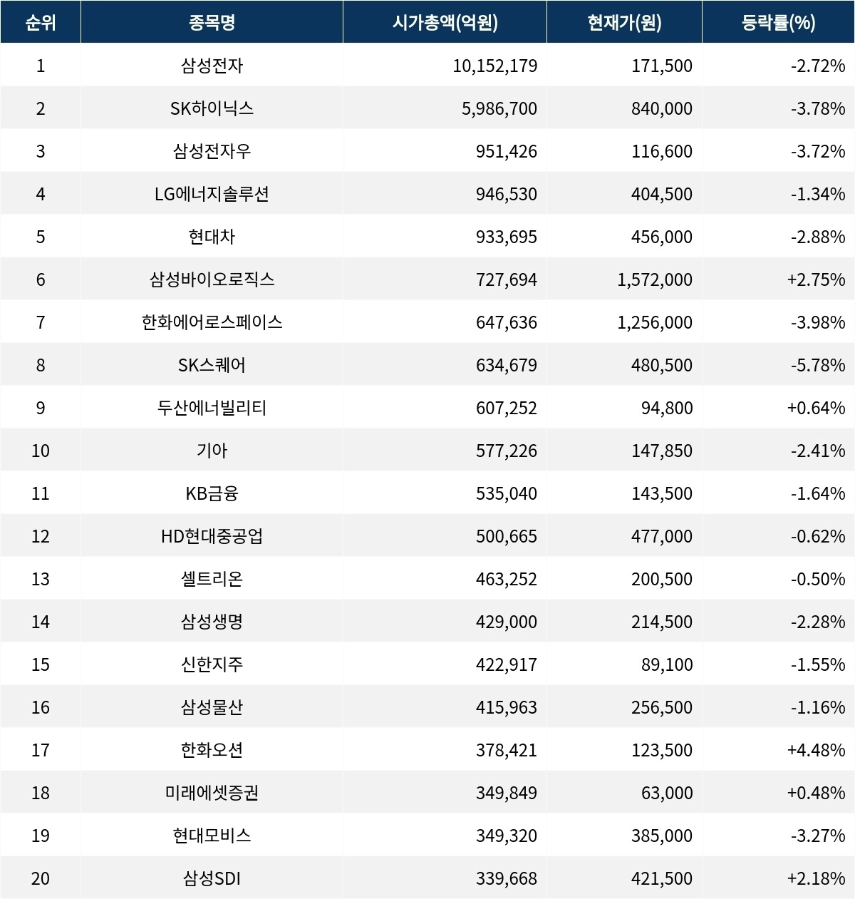 한편 시가총액 20위권 종목들은 KB금융(105560) ▼1.64%, HD현대중공업(329180) ▼0.62%, 셀트리온(068270) ▼0.50%, 삼성생명(032830) ▼2.28%, 신한지주(055550) ▼1.55%, 삼성물산(028260) ▼1.16%, 한화오션(042660) ▲4.48%, 미래에셋증권(006800) ▲0.48%, 현대모비스(012330) ▼3.27%, 삼성SDI(006400) ▲2.18% 등의 성적을 기록하고 있다.