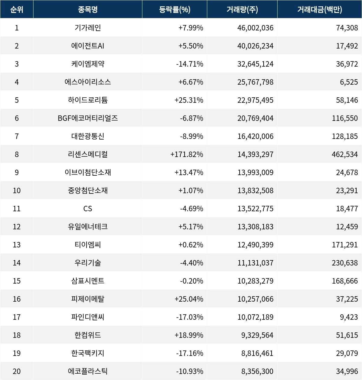 한편 거래량 상위 20위권 종목들은 CS(065770) ▼4.69%, 유일에너테크(340930) ▲5.17%, 티이엠씨(425040) ▲0.62%, 우리기술(032820) ▼4.40%, 삼표시멘트(038500) ▼0.20%, 피제이메탈(128660) ▲25.04%, 파인디앤씨(049120) ▼17.03%, 한컴위드(054920) ▲18.99%, 한국팩키지(037230) ▼17.16%, 에코플라스틱(038110) ▼10.93% 등의 성적을 기록했다.