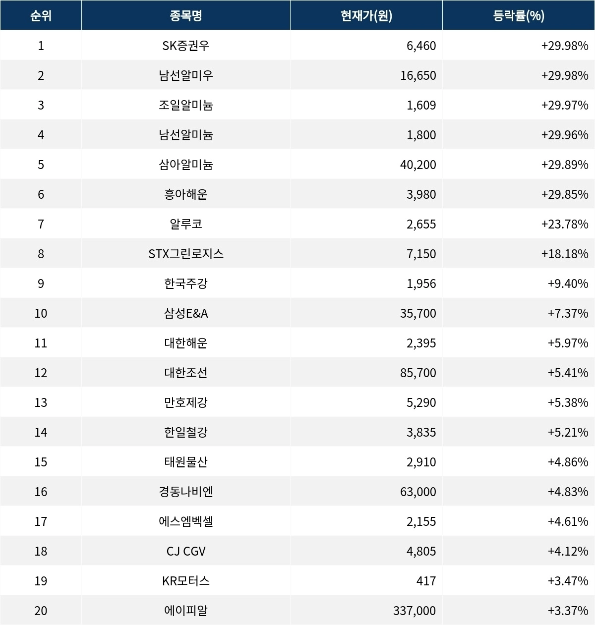 6위 흥아해운(003280)은 종가 3980원으로 29.85% 상승 마감했다. 7위 알루코(001780)는 종가 2655원으로 23.78% 상승 마감했다. 8위 STX그린로지스(465770)는 종가 7150원으로 18.18% 상승 마감했다. 9위 한국주강(025890)은 종가 1956원으로 9.40% 상승 마감했다. 10위 삼성E&A(028050)는 종가 3만 5700원으로 7.37% 상승 마감했다.