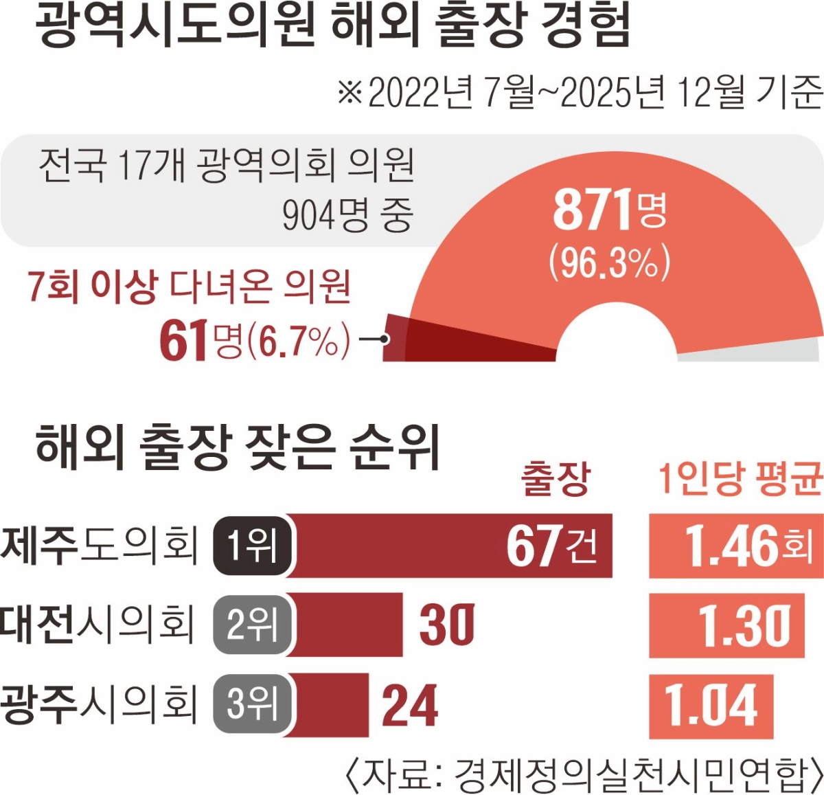 31일 경제정의실천시민연합(경실련)이 2022년 7월부터 2025년 12월까지 전국 17개 광역시도의회 의원들의 해외 출장 자료를 분석한 결과, 전체 904명 중 871명(96.3%)이 해외 출장을 다녀온 것으로 파악됐다. 3년 6개월간 7회 이상 해외 출장을 다녀온 의원도 61명(6.7%)이나 됐다. 해외 출장을 가장 많이 다녀온 사람은 김경학 제주도의원으로 총 16회를 다녀왔으며, 안성민 부산시의원이 14회를 다녀왔다.