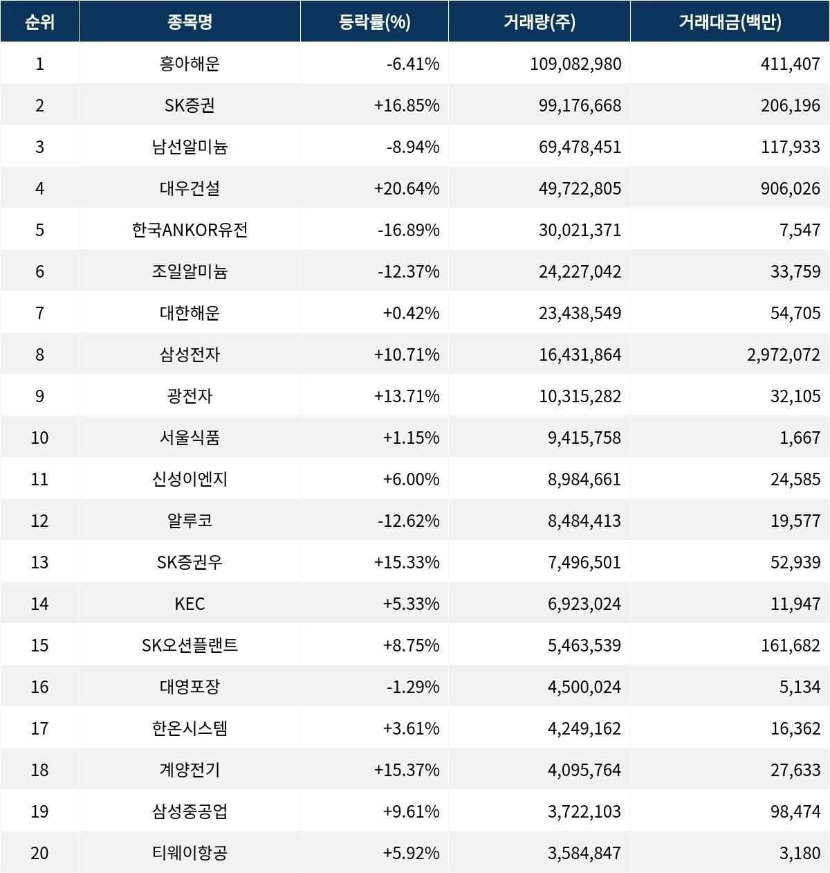 한편 거래량 상위 20위권 종목들은 신성이엔지(011930) ▲6.00%, 알루코(001780) ▼12.62%, SK증권우(001515) ▲15.33%, KEC(092220) ▲5.33%, SK오션플랜트(100090) ▲8.75%, 대영포장(014160) ▼1.29%, 한온시스템(018880) ▲3.61%, 계양전기(012200) ▲15.37%, 삼성중공업(010140) ▲9.61%, 티웨이항공(091810) ▲5.92% 등의 성적을 기록했다.