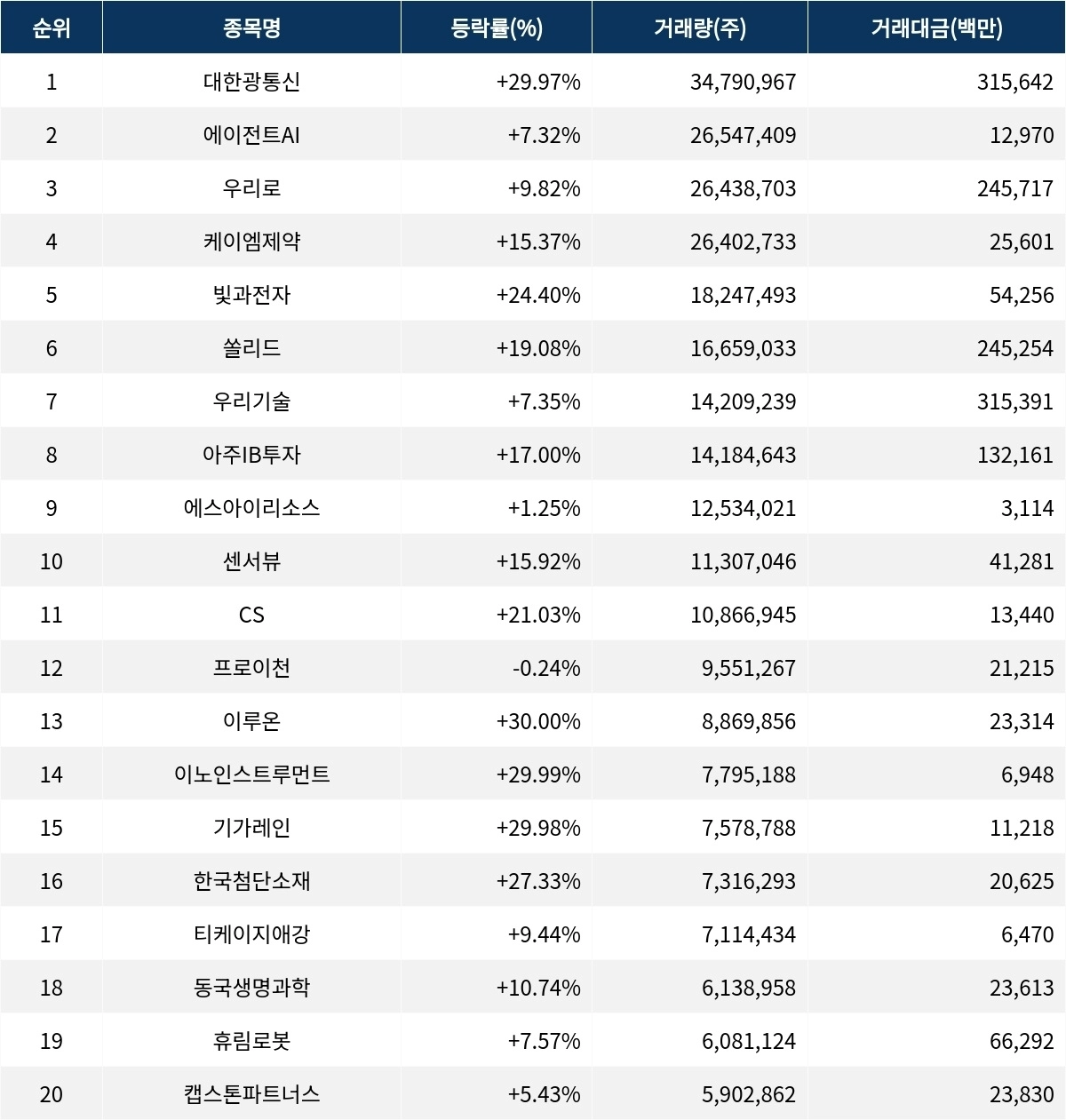 1일 한국거래소에 따르면 대한광통신(010170)이 3479만 주 이상 거래되며 코스닥 종목 중 실시간 거래량 1위를 차지하고 있다. 현재 주가는 9410원이며 시가총액은 1조 4631억원이다. 거래대금은 3156억 4200만원으로 시가총액의 약 21.57%에 달해 집중적인 매수세가 확인된다. 에이전트AI(060900)는 2654만 7409주 거래되며 거래량 2위를 기록하고 있으며 주가는 484원, 시가총액은 386억원이다. 거래대금은 129억 7000만원으로 시가총액의 33.60%에 해당한다.