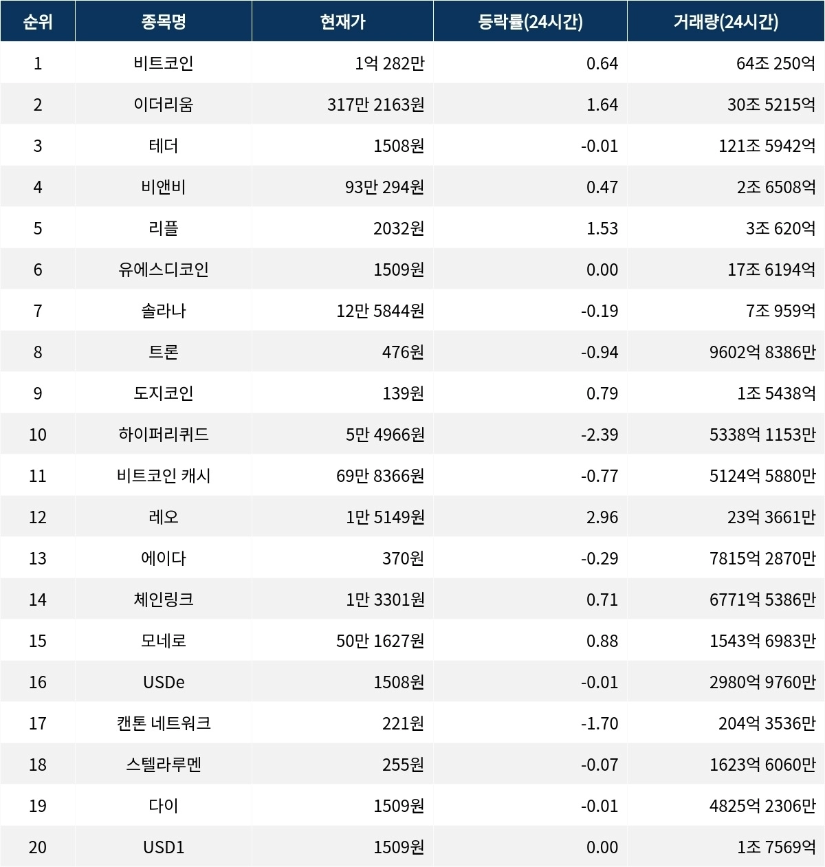 한편 솔라나는 12만 5844원에 거래되며 0.19% 하락했다. 시가총액은 72조 598억 원이다. 트론은 476원으로 0.94% 하락했다. 거래량은 9602억 8386만 원이다. 도지코인은 139원에 거래되며 0.79% 상승했다. 거래량은 1조 5438억 원이다.