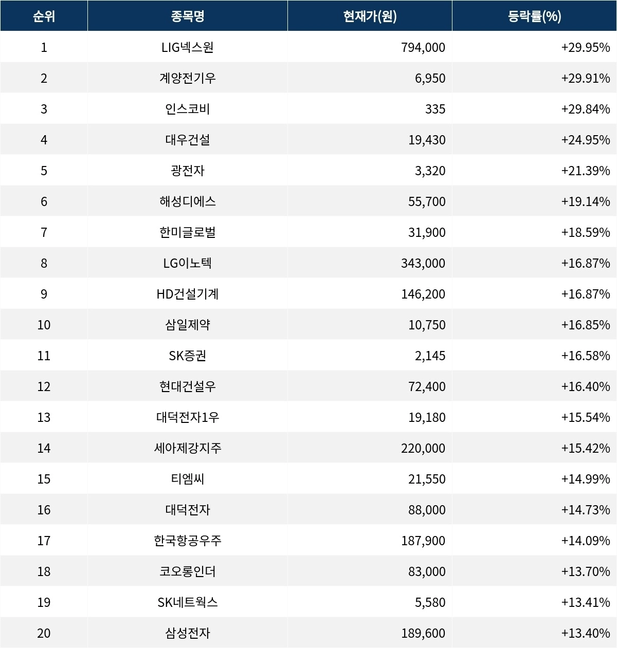 00원으로 17.65% 급등 마감했다. 상승률 5위 LG이노텍(011070)은 종가 34만 3000원으로 16.87% 급등 마감했다.6위 HD건설기계(267270)는 14만 6200원으로 16.87% 급등 마감했다. 7위 삼일제약(000520)은 1만 750원으로 16.85% 급등 마감했다. 8위