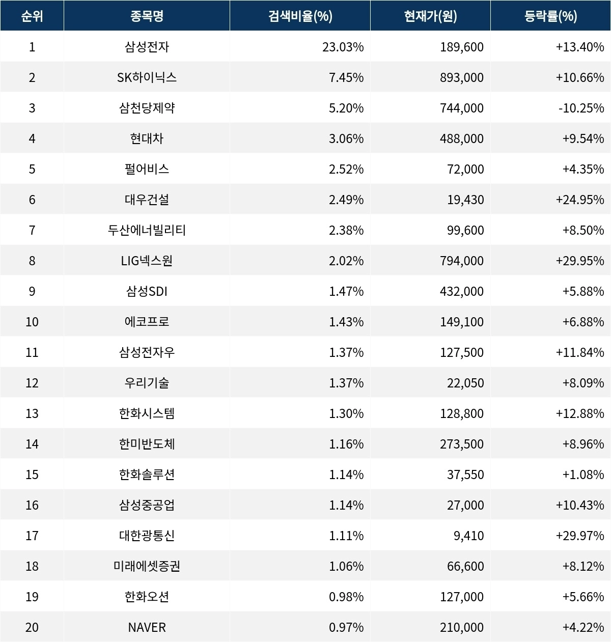 이어 검색 비율 2위의 SK하이닉스(000660)는 상승률 10.66%로 상승 마감했다. 검색 비율 3위의 삼천당제약(000250)은 10.25% 하락 마감했다. 검색 비율 4위 현대차(005380)는 9.54% 상승했다. 검색 비율 5위 펄어비스(263750)는 4.35% 상승했다.