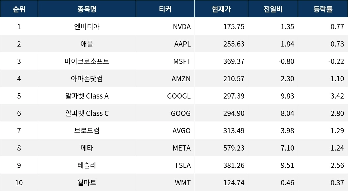 아마존닷컴(AMZN)은 1.10% 상승하여 210.57달러를 기록했다. 알파벳 Class A(GOOGL)는 3.42%의 두드러진 상승을 보이며 297.39달러로 마감했다. 알파벳 Class C(GOOG)도 2.80% 상승했다. 브로드컴(AVGO)은 1.29% 상승하며 313.49달러를 기록했다.