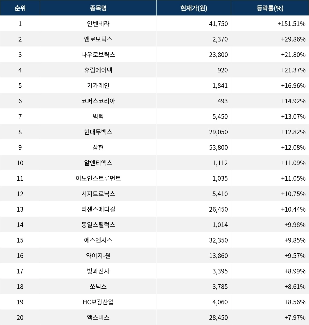 6위 코퍼스코리아(322780)는 현재가 493원으로 14.92% 급등 중이다. 7위 빅텍(065450)은 현재가 5450원으로 13.07% 급등 중이다. 8위 현대무벡스(319400)는 현재가 2만 9050원으로 12.82% 급등 중이다. 9위 삼현(437730)은 현재가 5만 3800원으로 12.08% 급등 중이다. 10위 알엔티엑스(123010)는 현재가 1112원으로 11.09% 급등 중이다.
