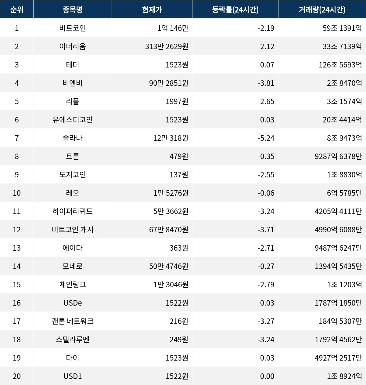 레오는 -0.06%의 미미한 하락으로 1만 5276원에 거래되고 있으며, 시가총액은 14조 690억 원이다. 하이퍼리퀴드는 -3.24% 하락한 5만 3662원에 거래 중이며, 시가총액은 13조 7421억 원이다. 비트코인 캐시는 -3.71% 하락하여 67만 8470원에 거래되고 있으며, 시가총액은 13조 5799억 원이다.