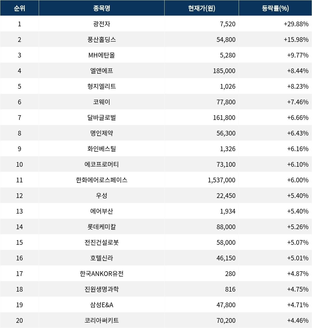 6위 코웨이(021240)는 종가 7만 7800원으로 7.46% 상승 마감했다. 7위 달바글로벌(483650)은 종가 16만 1800원으로 6.66% 상승 마감했다. 8위 명인제약(317450)은 종가 5만 6300원으로 6.43% 상승 마감했다. 9위 화인베스틸(133820)은 종가 1326원으로 6.16% 상승 마감했다. 10위 에코프로머티(450080)는 종가 7만 3100원으로 6.10% 상승 마감했다.