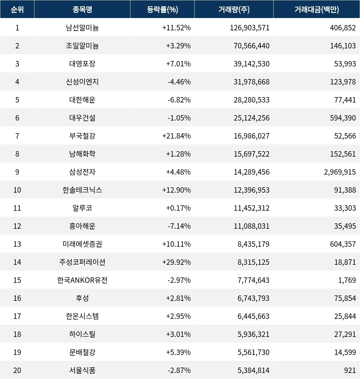 대영포장(014160)은 1374원으로 7.01% 상승하며 거래량은 3900만주를 기록하고 있다. 신성이엔지(011930)는 3750원에 거래되고 있으며 4.46% 하락하며 거래량은 3100만주에 달한다. 대한해운(005880)은 2665원으로 6.82%의 하락세를 보이며 2800만주의 거래량을 기록하고 있다. 대우건설(047040)은 2만 3500원으로 1.05% 하락, 거래량은 2500만주를 넘어섰다. 부국철강(026940)은 3180원으로 21.84% 폭등하며 거래량 1600만주를 기록하고 있다. 남해화학(025860)은 9510원에 거래되며 1.28% 상승, 거래량은 1500만주에 달한다. 삼성전자(005930)는 21만원으로 4.48% 상승하며 거래량은 1400만주를 기록 중이다. 한솔테크닉스(004710)는 7350원으로 12.90% 급등하며 거래량은 1200만주를 기록하고 있다.