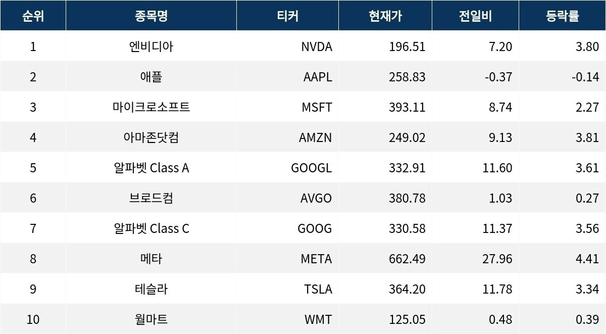 애플(AAPL)은 보합세를 보이며 0.14% 하락한 258.83달러로 마감했다. 알파벳 Class A(GOOGL)는 3.61% 상승하여 332.91달러로 거래를 마쳤다. 브로드컴(AVGO)은 0.27% 상승하며 380.78달러에 거래됐다. 알파벳 Class C는 3.56% 상승해 330.58달러에 마감했다.