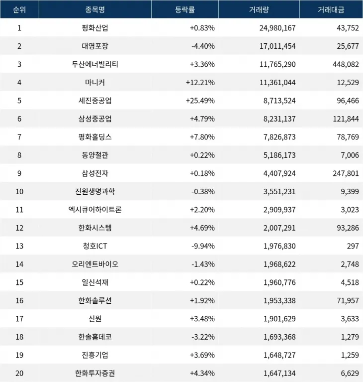 한편 거래량 상위 20위권 종목들은 엑시큐어하이트론(019490) ▲2.20%, 한화시스템(272210) ▲4.69%, 청호ICT(012600) ▼9.94%, 오리엔트바이오(002630) ▼1.43%, 일신석재(007110) ▲0.22%, 한화솔루션(009830) ▲1.92%, 신원(009270) ▲3.48%, 한솔홈데코(025750) ▼3.22%, 진흥기업(002780) ▲3.69%, 한화투자증권(003530) ▲4.34% 등의 성적을 기록했다.