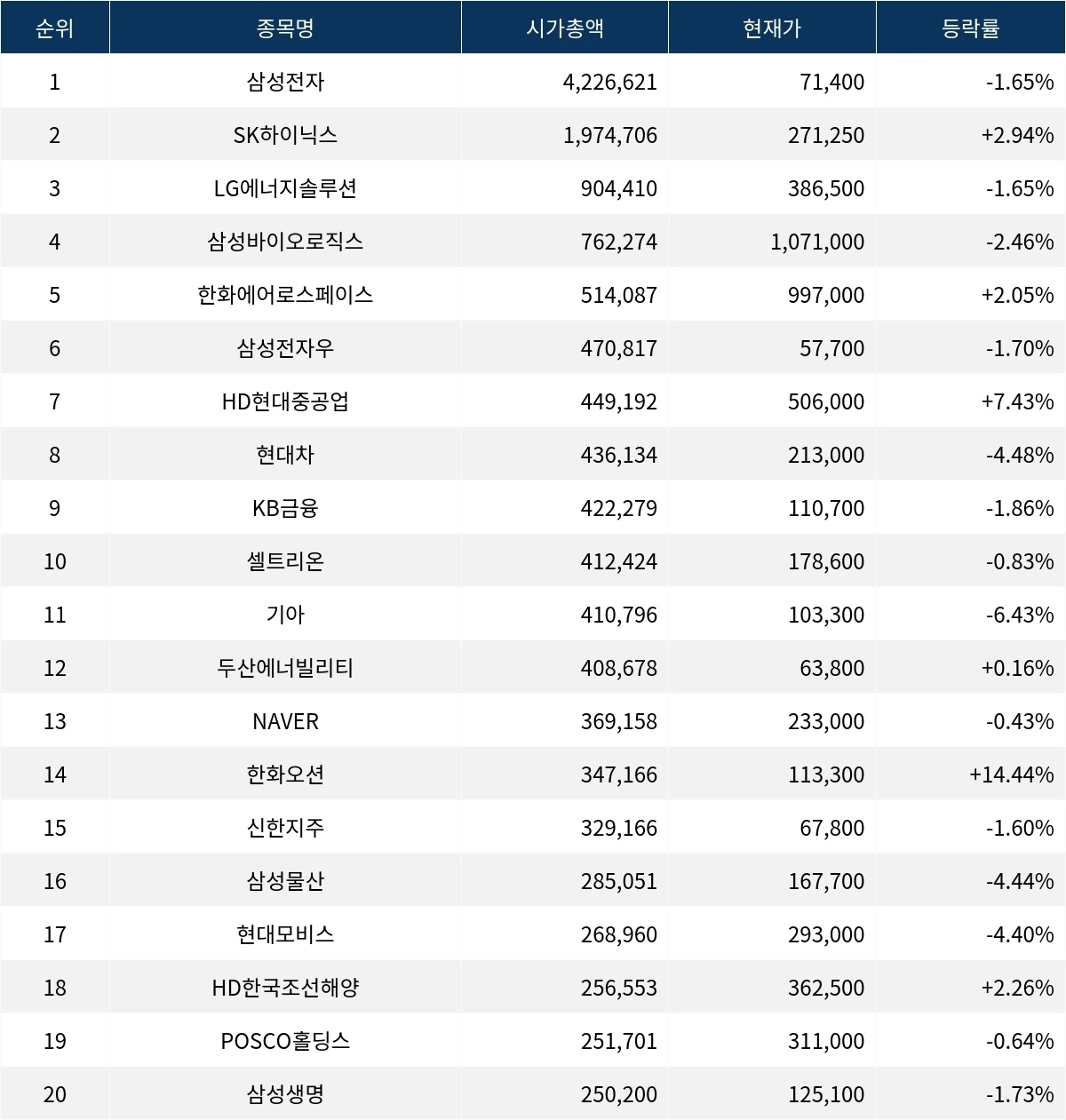 한편 시가총액 20위권 종목들은 기아(000270) ▼6.43%, 두산에너빌리티(034020) ▲0.16%, NAVER(035420) ▼0.43%, 한화오션(042660) ▲14.44%, 신한지주(055550) ▼1.60%, 삼성물산(028260) ▼4.44%, 현대모비스(012330) ▼4.40%, POSCO홀딩스(005490) ▼0.64%, 삼성생명(032830) ▼1.73% 등의 성적을 기록하고 있다.