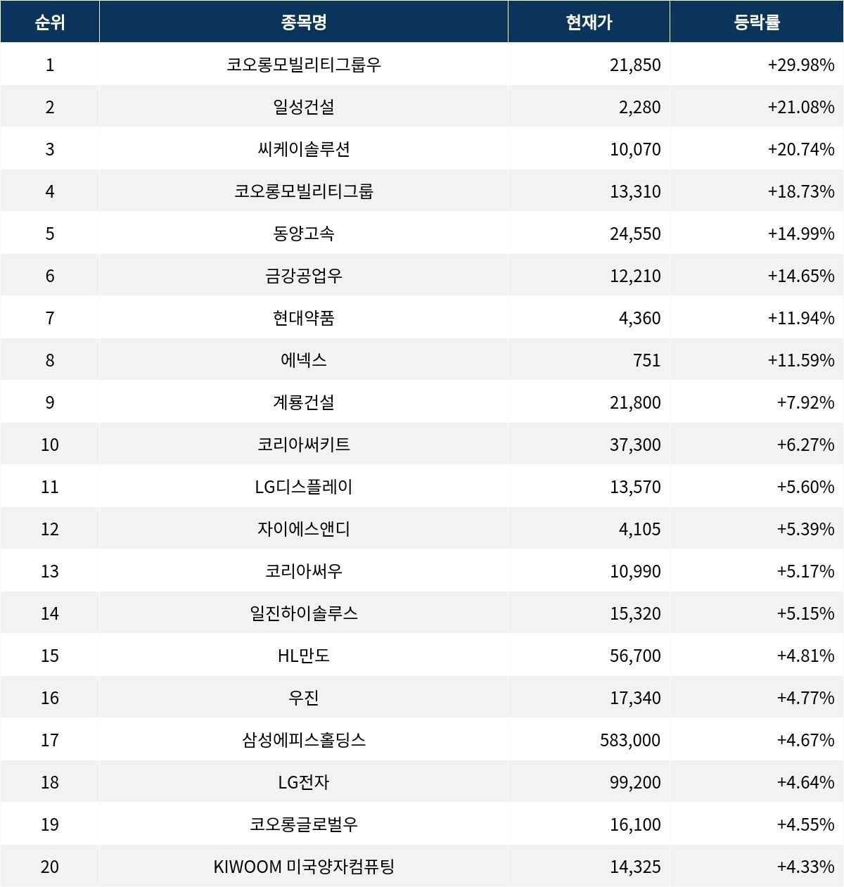 6위 금강공업우(014285)는 현재가 12,210원으로 14.65% 상승 중이다. 7위 현대약품(004310)은 현재가 4,360원으로 11.94% 상승 중이다. 8위 에넥스(011090)는 현재가 751원으로 11.59% 상승 중이다. 9위 계룡건설(013580)은 현재가 21,800원으로 7.92% 상승 중이다. 10위 코리아써키트(007810)는 현재가 37,300원으로 6.27% 상승 중이다.