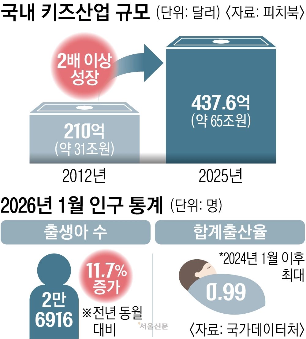 키즈 시장은 고가 소비에 주저하지 않는 ‘VIB’(Very Important Baby)’ 트렌드가 특징이다. 신세계백화점에서 명품 등이 포함된 수입 아동 분야 매출은 올해 1분기 전년 대비 21.5% 증가했다. 이는 일반 아동 제품군 성장률(10%)을 2배 이상 웃도는 수치다. 롯데백화점 역시 같은 기간 키즈 분야 매출이 전년 대비 20% 늘었다. 여기에 지난 1월까지 출생아 수가 19개월째 증가세를 이어가는 등 아이 울음소리가 커지면서 국내 키즈 산업 성장세는 당분간 지속될 것이란 전망이 나온다. 글로벌 금융 데이터 서비스업체 피치북에 따르면 국내 키즈 산업 규모는 지난해 약 65조원을 기록하며 2012년보다 2배 이상 성장한 것으로 추정된다.