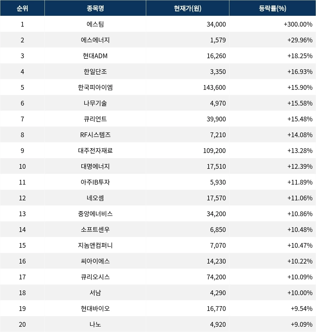 6위 나무기술(242040)은 현재가 4970원으로 15.6% 상승 중이다. 7위 큐리언트(115180)는 현재가 3만 9900원으로 15.5% 상승 중이다. 8위 RF시스템즈(474610)는 현재가 7210원으로 14.1% 상승 중이다. 9위 대주전자재료(078600)는 현재가 10만 9200원으로 13.3% 상승 중이다. 10위 대명에너지(389260)는 현재가 1만 7510원으로 12.4% 상승 중이다.