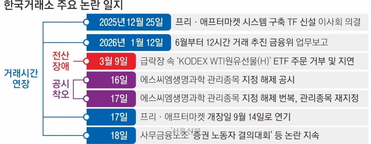 코스피가 6000선에 육박하며 증권업계가 전례 없는 호황을 누리는 가운데, 한국거래소는 잇단 운영 혼선으로 신뢰 시험대에 올랐다. 불과 일주일 사이 ‘전산 장애에 따른 거래 지연’에 이어 ‘관리종목 지정 해제 번복’까지 발생하면서 투자자 불만이 확산하고 있다. 여기에 거래시간 연장까지 논란이 겹치며 시장 혼선이 이어지고 있다.