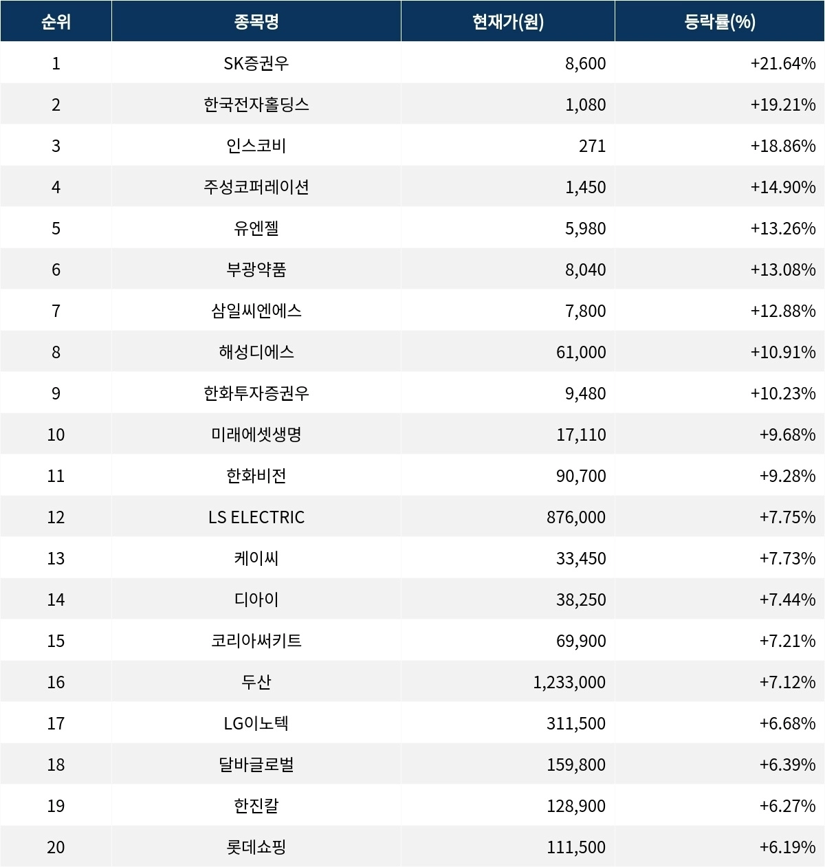 6위 부광약품(003000)은 현재가 8040원으로 13.08% 상승 중이다. 7위 삼일씨엔에스(004440)는 현재가 7800원으로 12.88% 상승 중이다. 8위 해성디에스(195870)는 현재가 6만 1000원으로 10.91% 상승 중이다. 9위 한화투자증권우(003535)는 현재가 9480원으로 10.23% 상승 중이다. 10위 미래에셋생명(085620)은 현재가 1만 7110원으로 9.68% 상승 중이다.